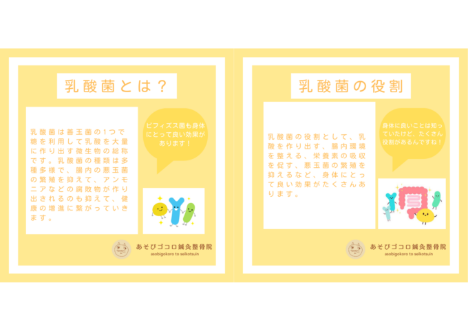 腸内細菌を整える乳酸菌 お知らせ2025.09.22 乳酸菌=ヨーグルトなどの発酵食品に入っているイメージがあると思いますが、実は人の身体にも存在します。 小腸や大腸には様々な腸内細菌がいますが、乳酸菌は善玉菌の一種で悪玉菌の繁殖を抑えてくれたりといい働きをしていきます。 腸内環境を整えると栄養吸収の向上、免疫力アップ、便秘や下痢の解消などにも繋がるので、積極的に摂るようにしましょう! 前の記事次の記事 一覧を見る カテゴリー最新記事 お知らせ2025.10.06 食物繊維は必要のない栄養? お知らせ2025.09.29 善玉菌を多くしよう! お知らせ2025.09.22 腸内細菌を整える乳酸菌