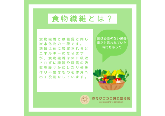 食物繊維は必要のない栄養? お知らせ2025.10.06 炭水化物はエネルギーになる糖質とエネルギーにならない食物繊維の二つに分けられます。 昔はエネルギーにならない食物繊維は必要ないと言われていましたが、糖質や脂質の吸収をやわらげたり便通を良くするなど身体にいい影響を与えます。 直接的に栄養にはならないですが、身体が働きやすくなるような環境を整えるために必要なので、毎日摂るようにしましょう! 前の記事次の記事 一覧を見る カテゴリー最新記事 お知らせ2025.10.06 食物繊維は必要のない栄養? お知らせ2025.09.29 善玉菌を多くしよう! お知らせ2025.09.22 腸内細菌を整える乳酸菌