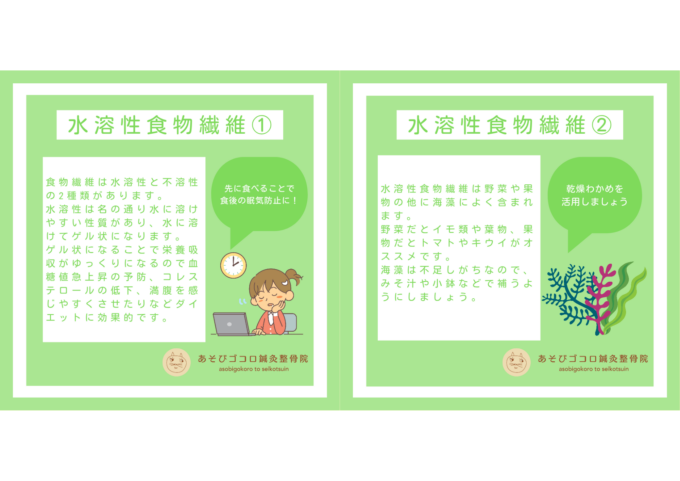 水溶性食物繊維 お知らせ2025.10.14 水溶性食物繊維とは水に溶ける性質のある食物繊維で、ゲル状になります。 そのゲル状の食物繊維が入ってきた栄養素を胃で包み込むことによって、栄養吸収がゆっくりになります。 特に糖質は身体に急激に取り込まれると血糖値が急上昇し、食後の身体のだるさや糖尿病になる原因にもなってしまうので、食事の前に摂ることが重要です。 ただし吸収がゆっくりになるだけで吸収量は変わらないので、食事量には気をつけましょう! 前の記事 一覧を見る カテゴリー最新記事 お知らせ2025.10.14 水溶性食物繊維 お知らせ2025.10.06 食物繊維は必要のない栄養? お知らせ2025.09.29 善玉菌を多くしよう!