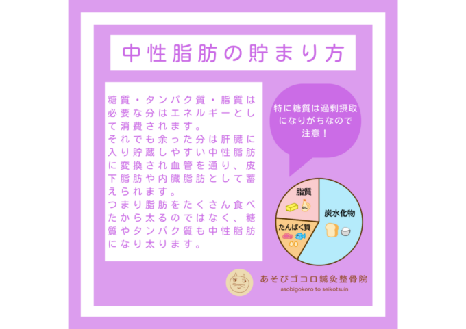糖質の摂りすぎに注意! お知らせ2025.11.03 脂っこいものを食べたら脂肪が増えるイメージを持っている方もいると思いますが、それだけではありません。食べ過ぎにより中性脂肪は増えやすく、特にご飯やパン・麺類などの糖質がエネルギーにならずに余ると脂肪に変換されるので、糖質の食べ過ぎに注意しましょう! 前の記事 一覧を見る カテゴリー最新記事 お知らせ2025.11.03 糖質の摂りすぎに注意! お知らせ2025.10.27 少しは必要、中性脂肪 お知らせ2025.10.20 不溶性食物繊維